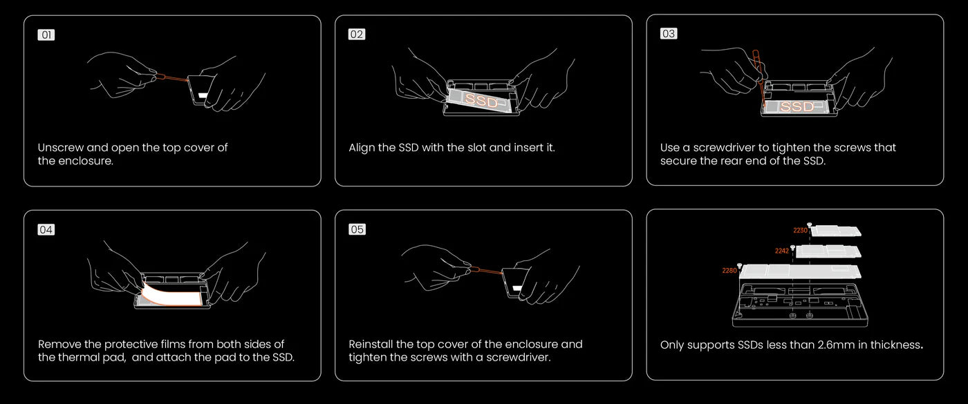 - Compatible with M.2 NVMe SSDs (2280/2242/2230).