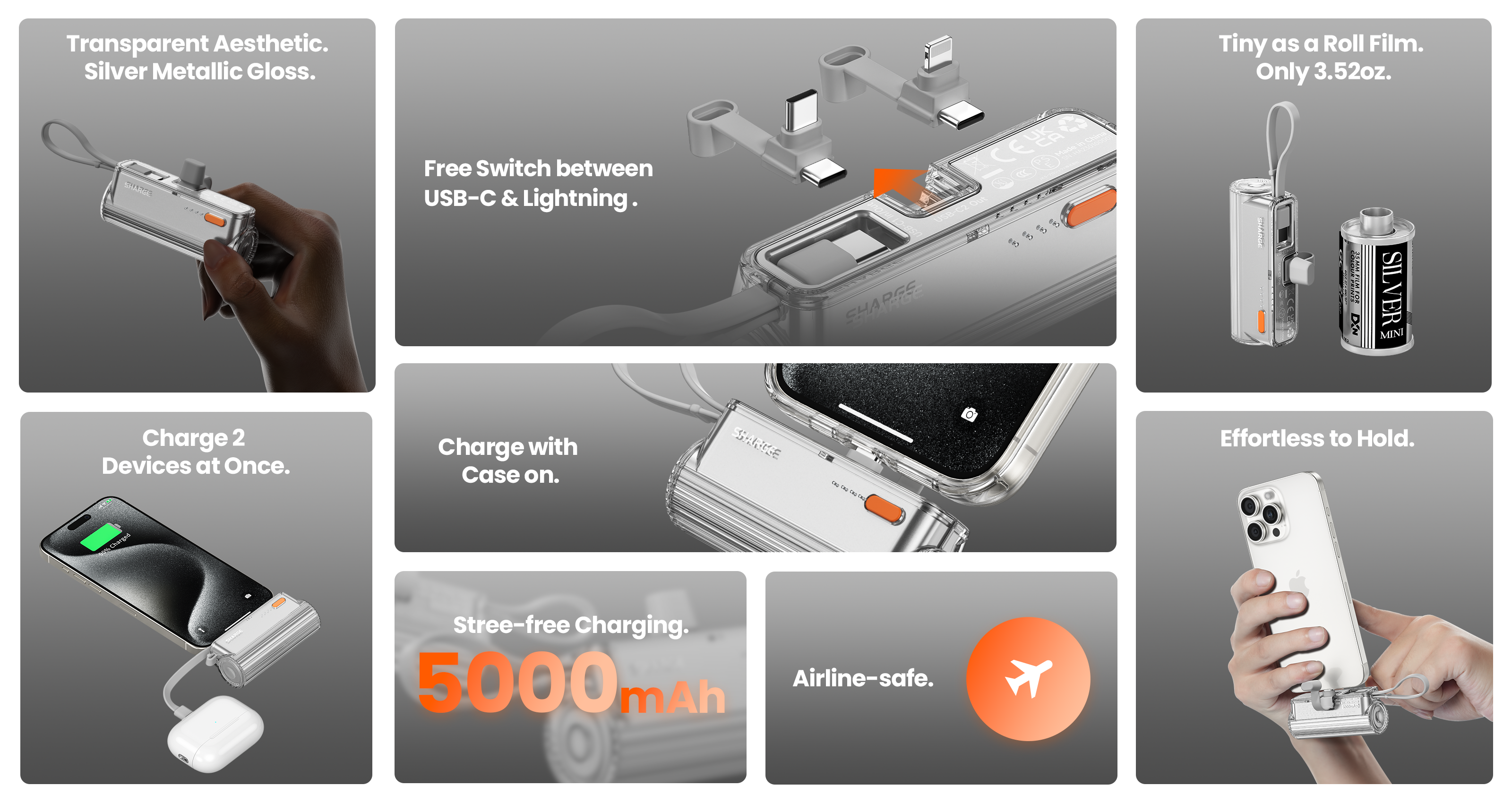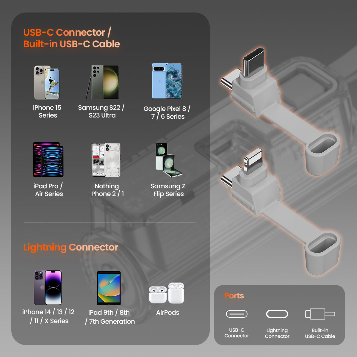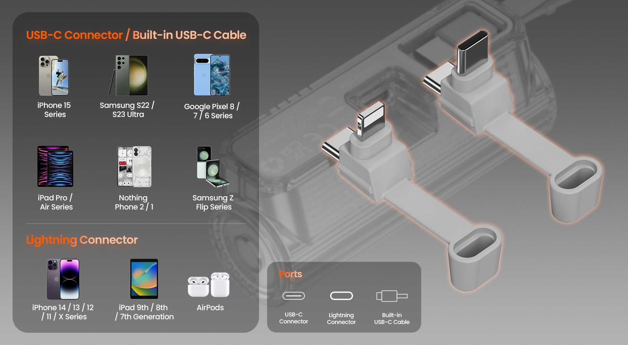 Switch freely between USB-C and Lightning with our interchangeable connectors design.