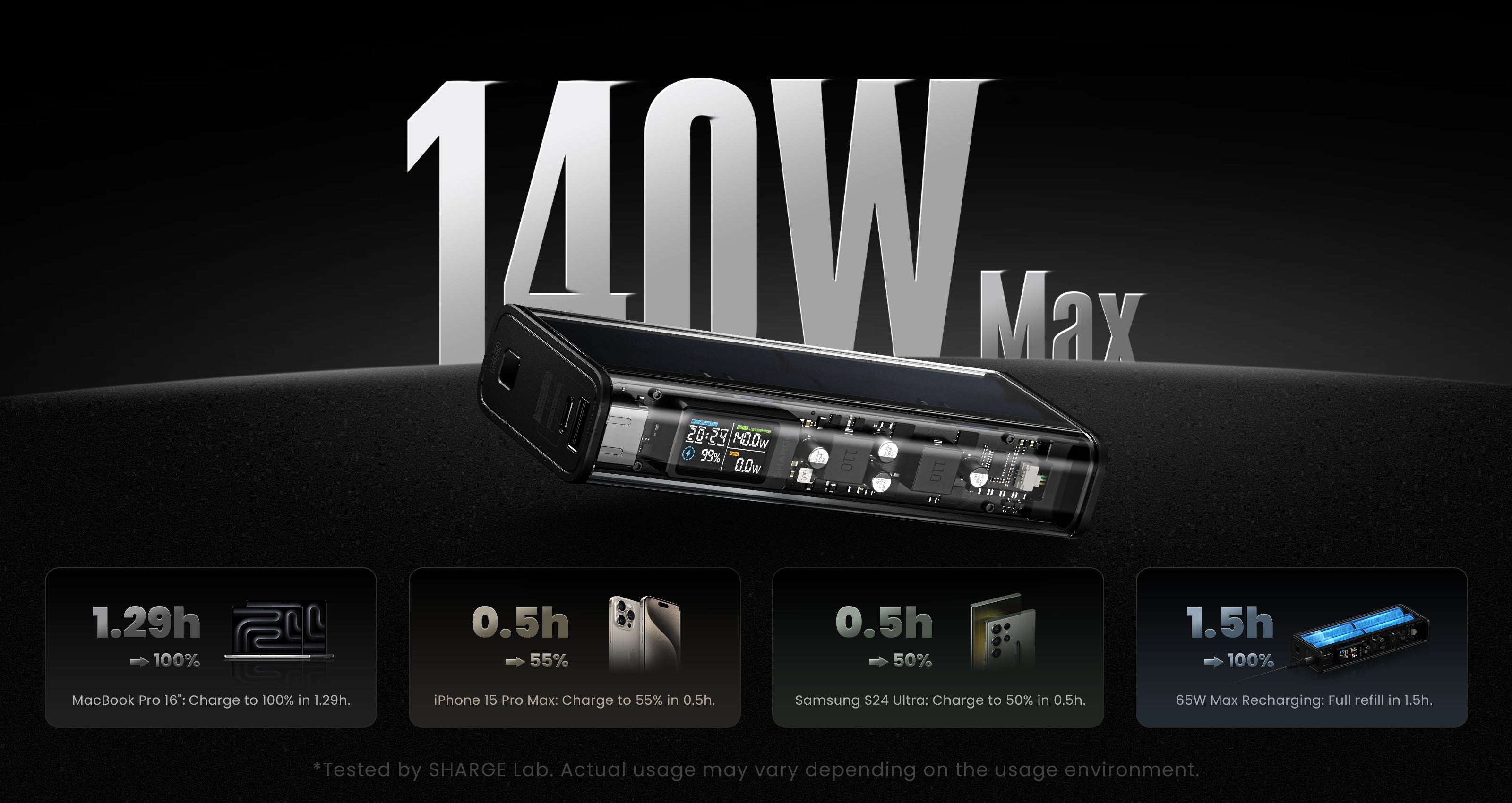 Max 140W power with max 100W single port output. Charges up a MacBook Pro from 0%-50% within only 40 mins, iPhone 15 Pro from 0%-50% within only 30 mins.